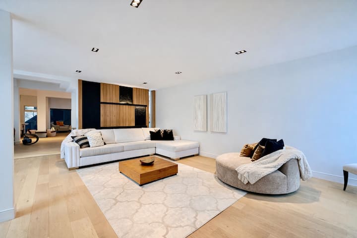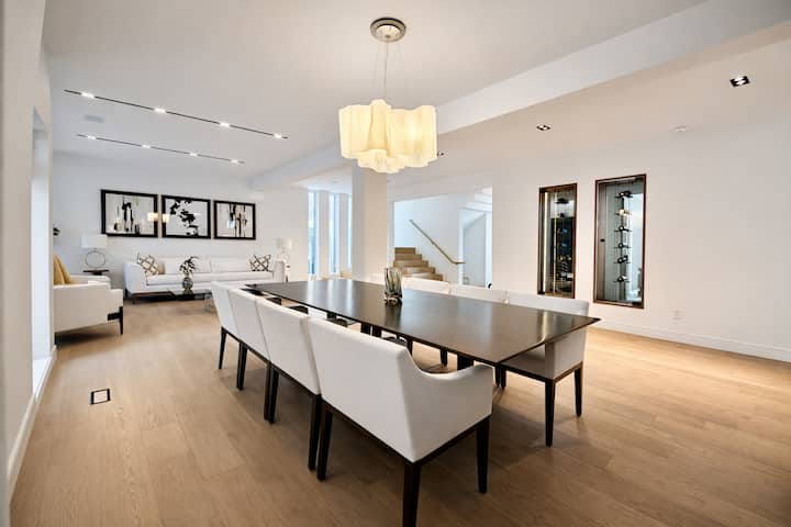 La lumière naturelle inonde la maison grâce à de vastes vitrages et puits de lumière, mettant en valeur les menuiseries sur mesure, les planchers de bois franc à larges planches, les surfaces en marbre et l'éclairage design. Les espaces de vie et de divertissement à aire ouverte s'enchaînent sans effort, offrant à la fois grandeur et intimité, parfaits pour accueillir, se détendre ou travailler en toute intimité.