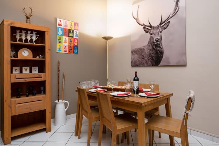 Le Majestic 76 est un appartement rénové avec style dans Chamonix centre avec 2 chambres et 1 salle de bain, pour 4 à 6 personnes, proche remontées mécaniques et bus, machine à laver, lave-vaisselle, TV, parking, wifi.