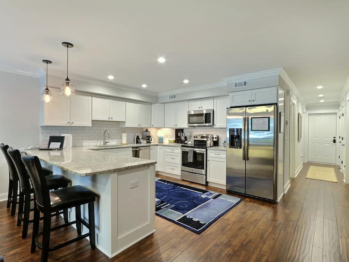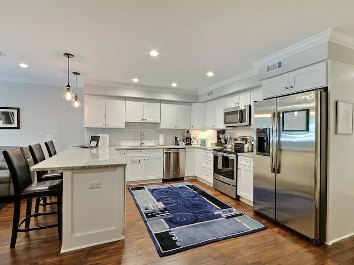 Entrez dans ces locations de vacances à Savannah et profitez du plan d'étage ouvert avec du parquet, d'un salon avec une grande télévision à écran plat et d'un accès facile à la cuisine et à la salle à manger. La cuisine gastronomique est entièrement équipée avec de nouveaux appareils électroménagers en acier inoxydable, un immense évier et de vastes plans de travail en granit. Il y a trois places disponibles au bar, puis un joli ensemble de salle à manger rétro à proximité offre des sièges pour deux autres personnes. Le look large et ouvert est idéal pour socialiser. Le salon dispose également de deux grandes fenêtres pour laisser entrer le soleil de Savannah. Dans la chambre, vous trouverez un grand lit et une grande télévision murale à écran plat, ainsi qu'une literie et une décoration confortables dans un bleu relaxant. La salle de bain est équipée de tout ce dont vous aurez besoin pendant votre séjour et vous trouverez également un lave-linge et un sèche-linge empilés dans l'unité. La meilleure partie de cette maison pourrait être le grand patio fermé avec un ameublement en osier et des endroits pour préparer des boissons. Encadré par des plantes et face à une façade en briques, il s'agit d'une escapade tropicale miniature.