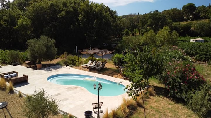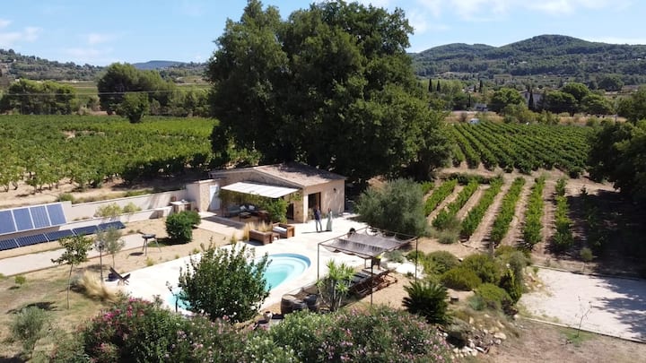 Entièrement autonome, piscine, au cœur d’une 10aine d’hectares de vignes, à 10mn des plages