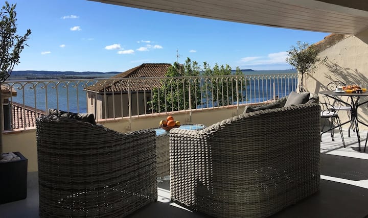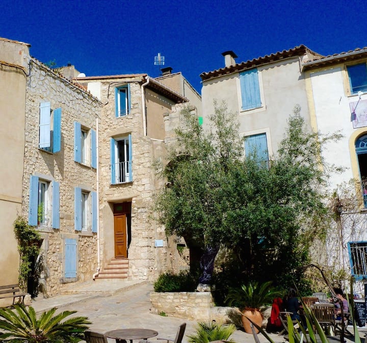 Nous sommes tombés amoureux du style français et du caractère de cette belle maison la première fois que nous l'avons vue. Rénové avec amour tout en conservant son authentique style français, il se trouve dans le meilleur endroit de la place principale du pittoresque village de pêcheurs méditerranéen de Bages, situé entre les vignobles, les lagunes d'eau salée et la mer. La maison donne sur la place du village et les toits avec vue depuis chaque chambre et depuis le toit-terrasse jusqu'à l'eau scintillante du lagon et de la Méditerranée.