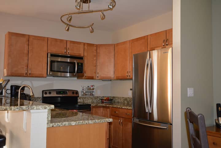 Notre condo est léger et aéré, et chaud en hiver ! Le salon comprend une cheminée à gaz, un téléviseur HD 50"avec un lecteur Blu-ray connecté Wi-Fi pour télécharger des films via vos abonnements, un canapé/lit queen size, des sièges confortables et un petit déjeuner/bar à vin ! La chambre principale dispose d'un lit queen size confortable avec une TV HD 32", une porte coulissante à notre charmant patio, et un grand placard avec beaucoup d'espace. La deuxième chambre dispose également d'un lit queen size confortable, d'un téléviseur HD 32"et d'un grand placard avec beaucoup d'espace. La salle de bain principale est joliment carrelée, a un comptoir en granit, une baignoire/douche entièrement carrelée et comprend de nombreux équipements. La deuxième salle de bain est joliment carrelée, a un comptoir en granit, une baignoire/douche entièrement carrelée et comprend de nombreux équipements. La salle à manger peut accueillir confortablement 6 adultes. La cuisine entièrement équipée offre tout ce dont vous aurez besoin, que vous cuisiniez ou que vous apportiez des « plats à emporter ». Le condo comprend également une laveuse et une sécheuse. Un Pack ’n Play est disponible sur demande. Le Lodge et notre condo sont non-fumeur - de toute nature.