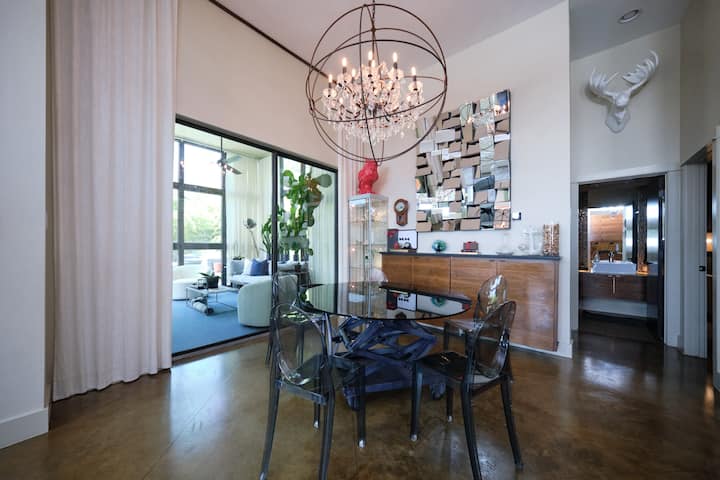 Prolongez votre expérience à l'extérieur en vous avançant sur le vaste balcon, où une vue panoramique sur Austin se déploie devant vous. Rassemblez vos amis et votre famille autour du généreux coin salon ou savourez un délicieux repas en plein air à la grande table à manger. Plongez dans l'excitation du grand match sur la télévision de 60 pouces, ou détendez-vous dans la chaise suspendue, qui offre un perchoir confortable et surélevé pour profiter de l'air frais tout en admirant les environs pittoresques. Le balcon offre un mélange parfait de divertissement, de détente et de vues à couper le souffle, créant un havre de paix extérieur polyvalent et accueillant.