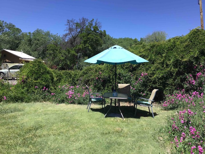 Nambe est une maison Ervin depuis plus de vingt-cinq ans ; nous l'appelons souvent Singing Waters pour les asqias qui sillonnent la vallée en apportant de l'eau à nos anciens peupliers, aux vergers et aux fermes voisines. Après avoir vendu notre journal à Crested Butte, l'attrait des arbres fruitiers, les vignes, le temps chaud et une belle maison traditionnelle en adobe nous ont tous attirés dans le nord du Nouveau-Mexique. L'enchantement n'a été accentué que lorsque nous avons découvert Nambe Falls, un endroit magique, à quelques minutes de la route. Venez nous rendre visite et vous détendre et explorer, peut-être que vous allez adorer aussi.