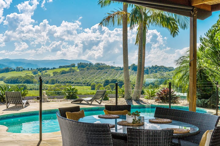 Perchée sur le point culminant d'une belle et privée parcelle surélevée de 5 acres dans l'arrière-pays de Byron Bay se trouve cette belle maison ouverte avec une vue imprenable sur l'arrière-pays. Une entrée privée bordée de pins encadre une longue route qui mène à la maison. Vous verrez souvent des animaux sauvages tels que des kangourous, des koalas et de nombreux oiseaux différents.