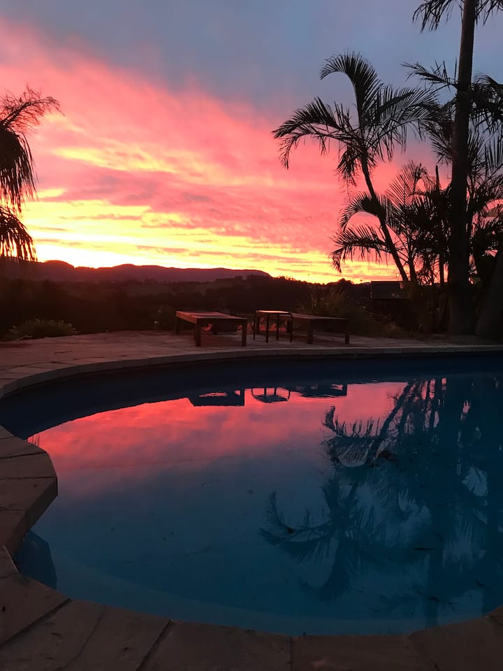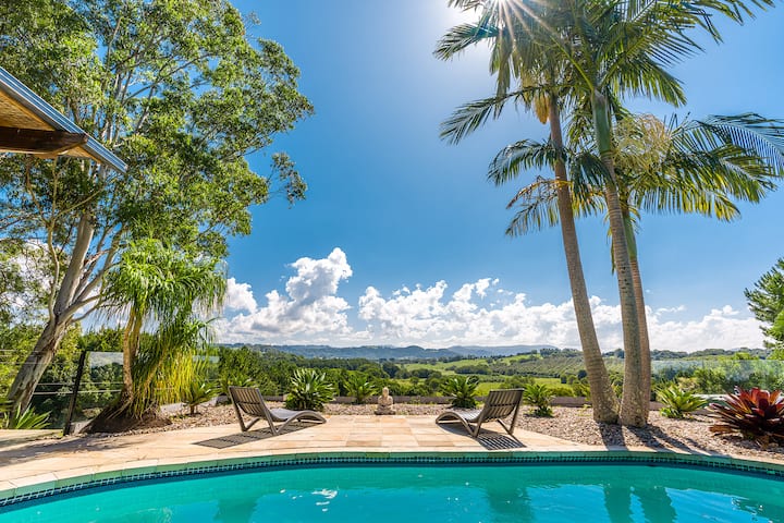À seulement 13 km du centre de Byron, notre propriété privée de 5 acres dispose d'un vaste espace de vie ouvert à l'intérieur/à l'extérieur avec une vue imprenable à 180 degrés sur l'arrière-pays et le coucher du soleil.