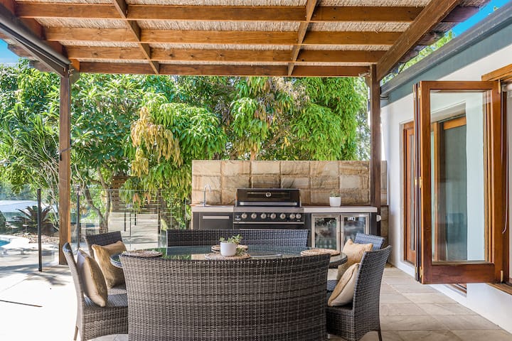À cette oasis de style complexe hôtelier se trouve une piscine, un sauna infrarouge, une cuisine extérieure, une salle à manger et un salon, un brasero, un trampoline et une immense terrasse divertissante parfaite pour que les amis et les familles puissent se détendre, s'amuser et passer du temps ensemble.