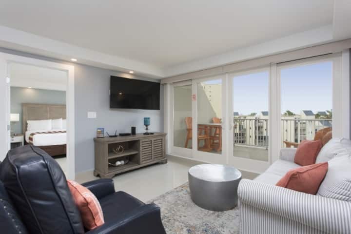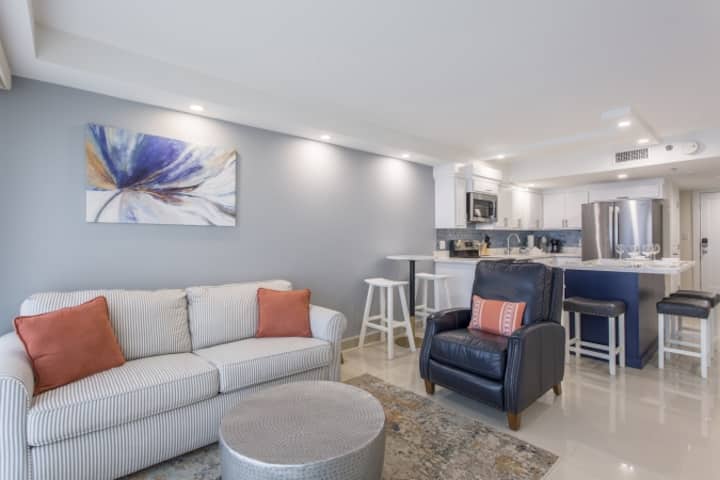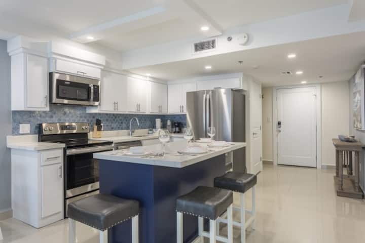 Située au 4e étage de la tour, notre maison de vacances est le choix idéal pour une famille ou un petit groupe. Nos espaces de vie, salle à manger et cuisine sont ouverts et remplis de lumière depuis les grandes fenêtres du complexe hôtelier. La chambre principale dispose d'un lit king size et d'un balcon privé, tandis que la chambre d'hôtes dispose de deux lits doubles avec un triple drap de classe mondiale. Notre luxueuse salle de bains est spacieuse et dispose d'une douche à l'italienne et de doubles éviers. Nos balcons privés offrent une vue imprenable sur la piscine et un terrain tropical de 15 acres. Une courte promenade de 60 secondes vous fera vous détendre sur la plage de sable et profiter de vos vacances.