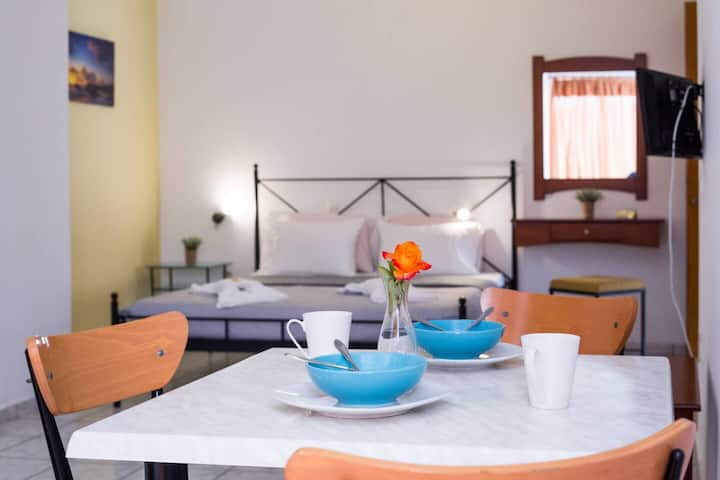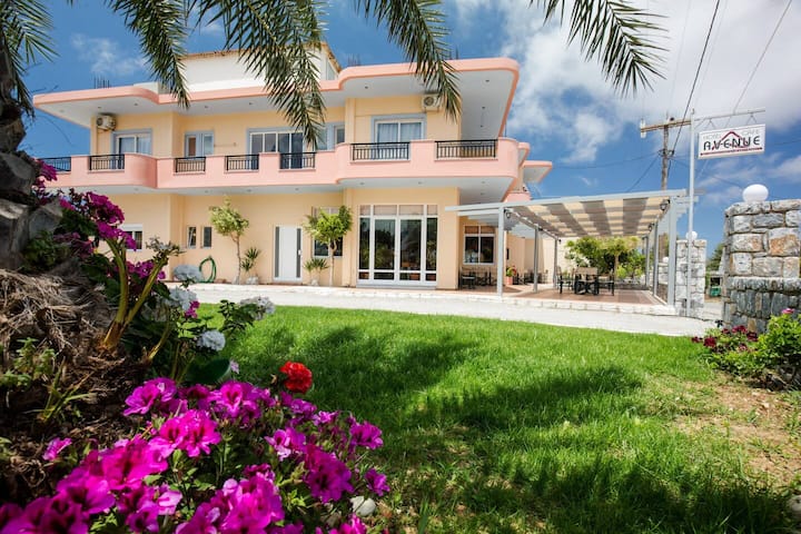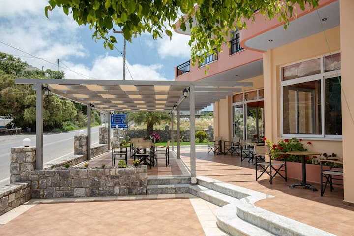 Je m'appelle Myros. J'ai travaillé avec le tourisme dès mon plus jeune âge en raison de l'entreprise familiale et en raison de la région que je vis, Falassarna, qui est principalement touristique. Je gère le logement avec mes parents, Irene et George.
