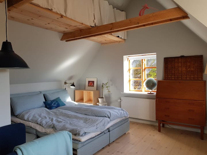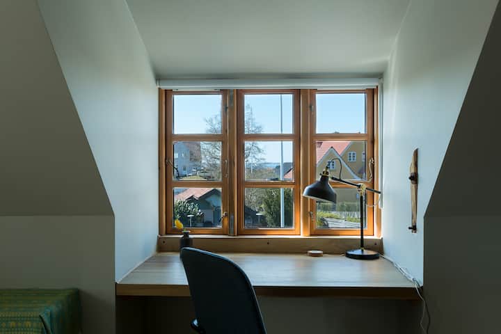 Chambre au 2e étage. La salle de bain et l'espace commun/salon avec des livres, etc. sont partagés avec l'autre chambre que nous louons. Vous pouvez également utiliser notre jardin si vous le souhaitez.
