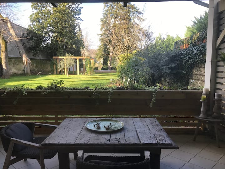 Garden apartment in secluded leafy grounds +pool