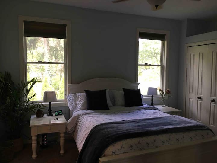 Suite MIL d'une chambre dans une maison privée avec salle de bain de qualité spa (douche à effet de pluie carrelée, avec jets corporels, porte-serviettes chauffants et sols chauffants). Foyer au gaz. Cuisine entièrement équipée. Entrée avant et arrière privée. Saisonnier (mai - octobre) utilisation de la piscine, de la terrasse, du barbecue et de l'espace partagé dans la cour arrière. Internet haut débit, télévision par câble, Netflix, Hulu, HBO, etc.Stationnement dans l'allée.