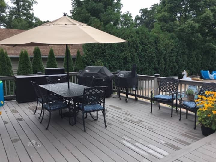 J'ai une longue allée avec un stationnement facile. Vous aurez un accès complet à l'ensemble de l'appartement par une entrée séparée. Vous avez aussi un accès illimité à la terrasse et à la cour arrière partagées. La piscine est disponible en saison ( généralement de mai à octobre, mais les conditions météorologiques réelles déterminent les dates d'ouverture et de fermeture) et sont fermées pour les mois d'hiver. La piscine et la cour sont réservées aux voyageurs sur la réservation.