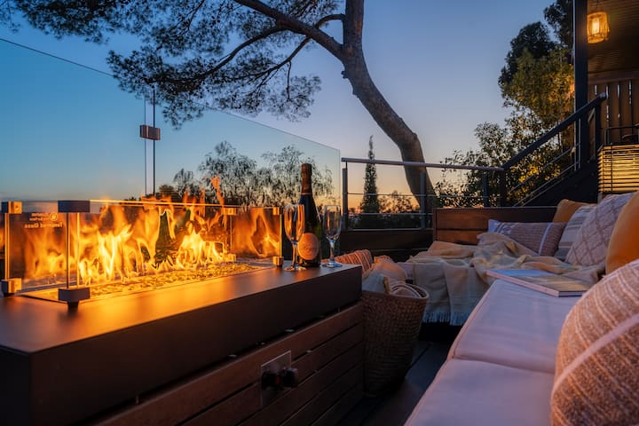 Profitez de la vue panoramique exceptionnelle depuis la large terrasse en bois orientée au Sud. Vous pourrez aisément vous reposer dans les transats ou le grand canapé méridienne à l’ombre des grands pins de Provence qui s’éclairent à la tombée de la nuit.