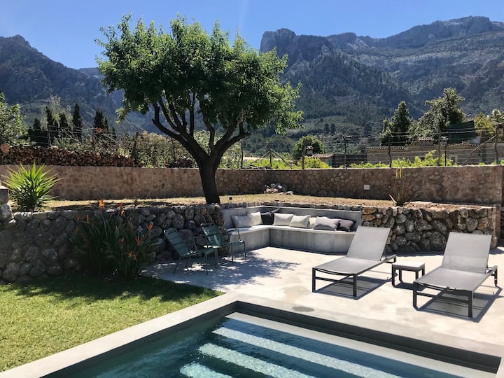 INTÉRIEUR | Le salon élégant offre une bonne place pour 6 personnes et plus, un éclairage ambiant et tous les autres «éléments de base» modernes comme le wifi, la télévision par satellite, Sonos hifi ánd, peu probable, au cas où il pleuve un lecteur DVD avec une collection attrayante de films et une bibliothèque de livres classiques. Les 3 chambres disposent d'un éco-airco, de lits de qualité bien sûr et de salles de bains privées (dont 2 attenantes) avec douches à effet pluie. Il y a 2 toilettes séparées, les deux à l'extérieur. Et puis la zone la plus importante, la spacieuse cuisine ouverte. Avec vue. À la piscine ánd Puig Mayor. Une grande table pour 8 personnes et plus... «mangez votre cœur» avec des «friandises pour les gourmets» comme un vinoteca avec une collection spéciale de vins (pas sur la maison;-), Solis pro presser/presse-agrume, machine Nespresso + moussant, casseroles et poêles Creuset et, bien sûr, un réfrigérateur-congélateur, un lave-vaisselle, un four, un four à micro-ondes et beaucoup de vaisselle + couverts. Le linge de lit et de bain et les pareos de piscine sont fournis et le lave-linge + sèche-linge est là si vous êtes toujours à court. Les murs épais gardent la casa naturellement fraîche et le chauffage au sol (dans toute la maison) garantit un confort tout au long de l'année. Le poêle à bois complète l'expérience ultime et intime du «cocon» (par exemple, pour ceux qui aiment échapper au froid et au chaos X-mas ou célébrer la fête du Nouvel An dans le style espagnol!)