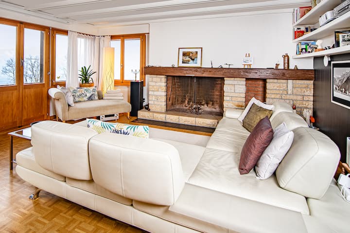 🛋️ Grand salon avec vue imprenable sur les Alpes et le lac de Thoune