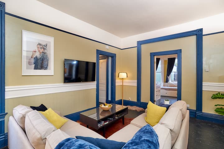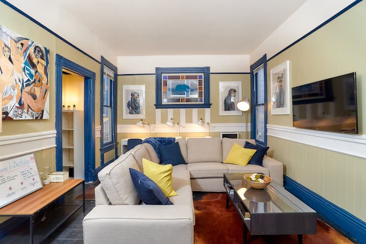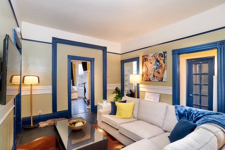 Ce logement offre un appartement moderne et haut de gamme entièrement meublé avec des finitions personnalisées et un mobilier moderne. Les voyageurs peuvent profiter d'équipements tels que le Wi-Fi, l'Internet haut débit et une télévision écran plat avec Roku, Netflix gratuit et des services de streaming. Tous les services publics essentiels sont couverts, y compris l'électricité, le gaz, l'eau, le chauffage, l'enlèvement des ordures et les égouts.