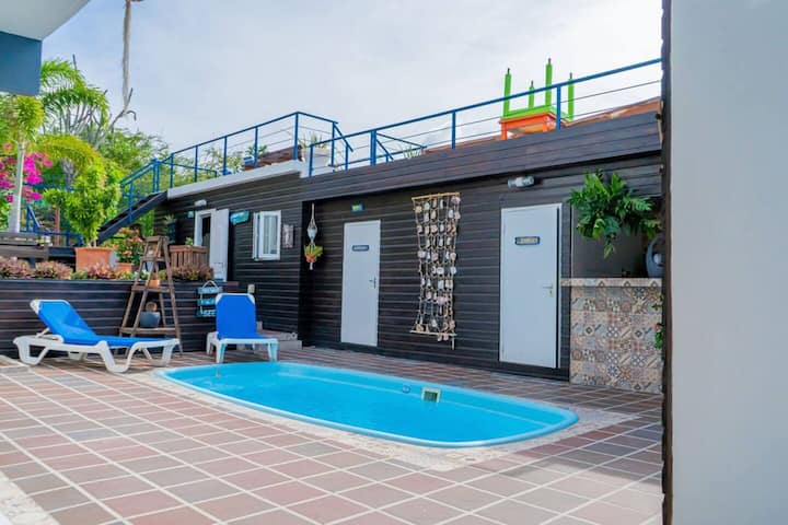 Dans notre studio au bord de la piscine, vous trouverez un appartement confortable d'une chambre avec un lit double et une salle de bain. Un escalier y mène depuis la piscine. Nous avons une petite kitchenette avec un réfrigérateur et un micro-ondes, bien que vous préfériez probablement aller dans les restaurants à proximité qui sont à quelques minutes à pied de la propriété. Vous pouvez également profiter des installations de l'espace commun telles que le toit-terrasse.