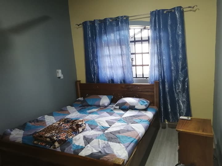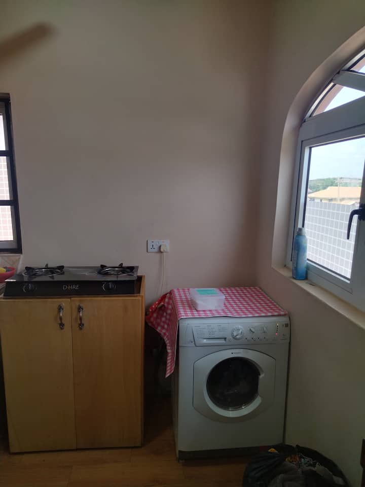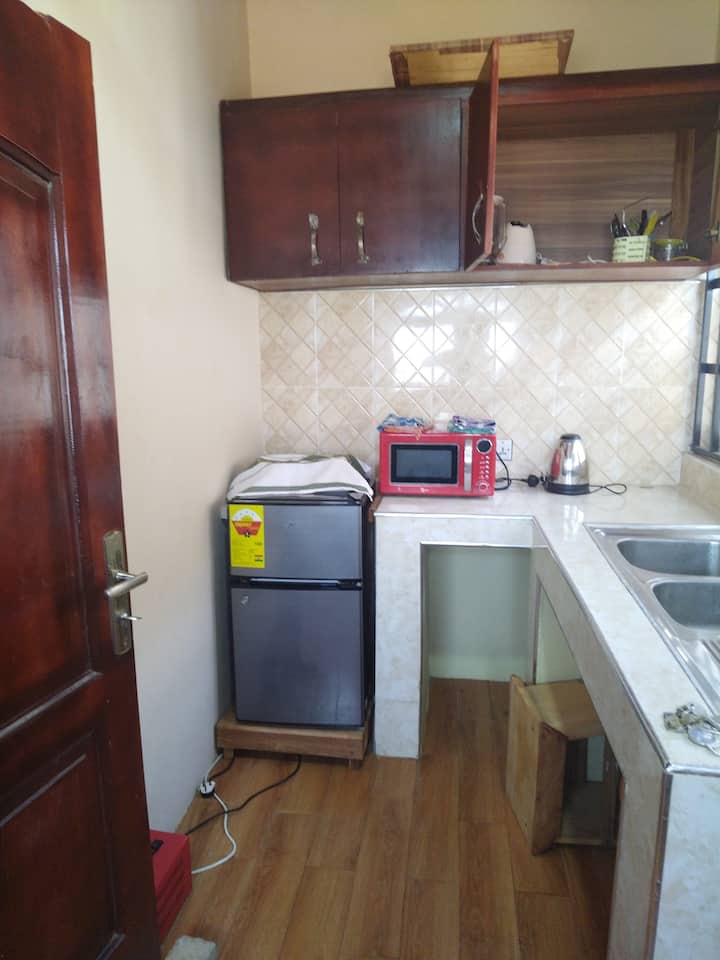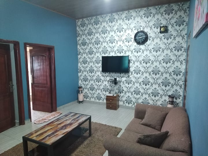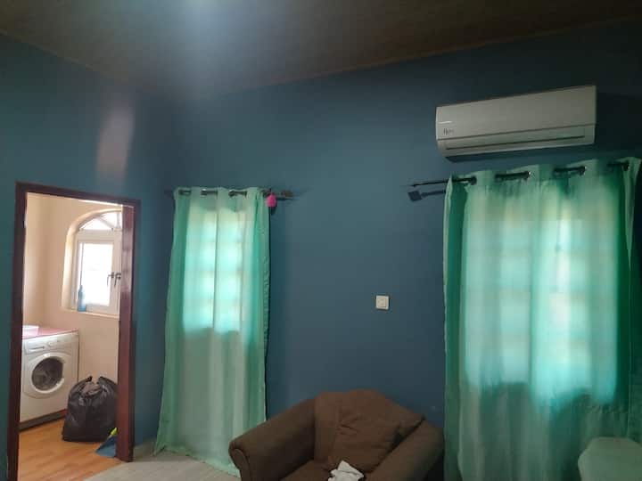 une chambre, un salon, une cuisine, une salle de bain et des toilettes