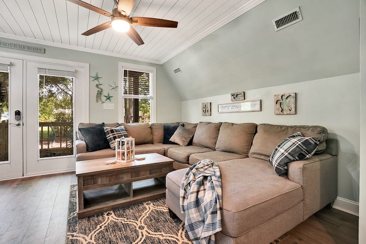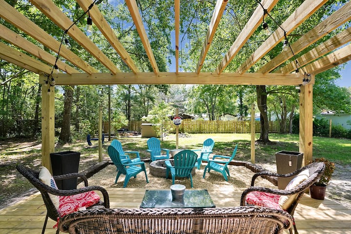 À 5 min de la plage et des bases. Arrivée autonome et espace extérieur incroyable avec foyer.