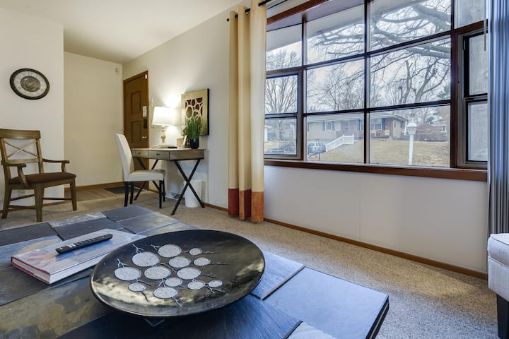 Cette charmante maison de 2 chambres est magnifiquement décorée et offre de nombreux équipements, y compris des meubles et des appareils électroménagers élégants (cuisinière, lave-vaisselle, réfrigérateur, micro-ondes, laveuse/sécheuse, etc.). Il est situé juste à côté de la Belt Highway, près de l'autoroute I-29 et de la 36 Highway. Vous allez adorer mon logement pour son confort, sa propreté, ses commodités, sa rue calme, son stationnement hors rue, etc.