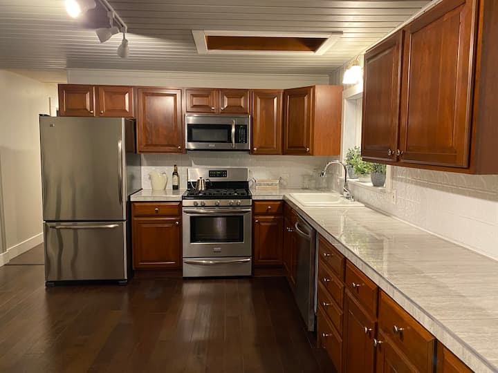 Maison entière. Remarque : les voyageurs n'auront pas accès au garage. Il y a un parking à 2 places en haut de l'allée à côté du garage ainsi que de nombreuses places de stationnement au niveau de la boîte aux lettres. Si vous vous garez en haut, veuillez reculer avec précaution.