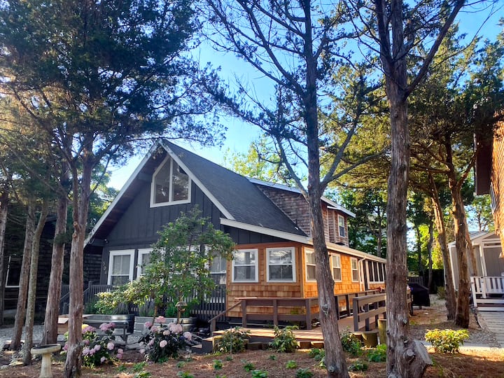 Maison confortable et moderne avec 4 chambres et 3 salles de bain complètes. À un pâté de maisons de la plage (8 étiquettes incluses). Beaucoup d'espace pour une famille ou un grand groupe. Spacieux, plan d'étage ouvert en bas, 2 grands espaces extérieurs (où vous pouvez entendre les vagues se briser et sentir la brise fraîche de l'océan), cour arrière et douche extérieure. Familial, calme, un véritable bijou caché. Un court trajet à vélo ou en Uber jusqu'à Cape May. Location à la semaine (du samedi au samedi) en été (de juin à début septembre).