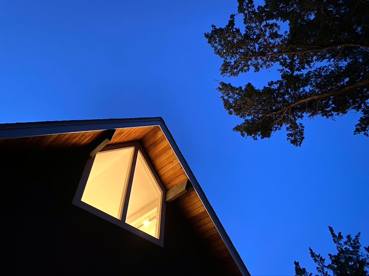 • 2e étage, porche arrière : cette petite oasis cachée se trouve à l'arrière du chalet triangulaire, avec un canapé d'extérieur modulable et des chaises longues.