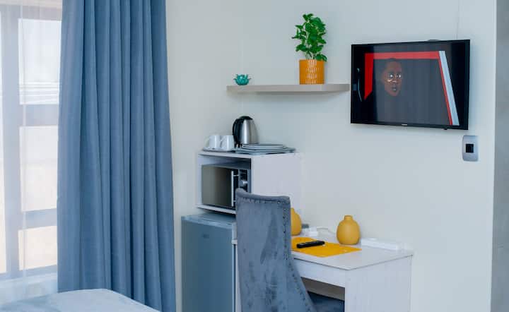 Une chambre avec wifi bien aménagée pour travailler.