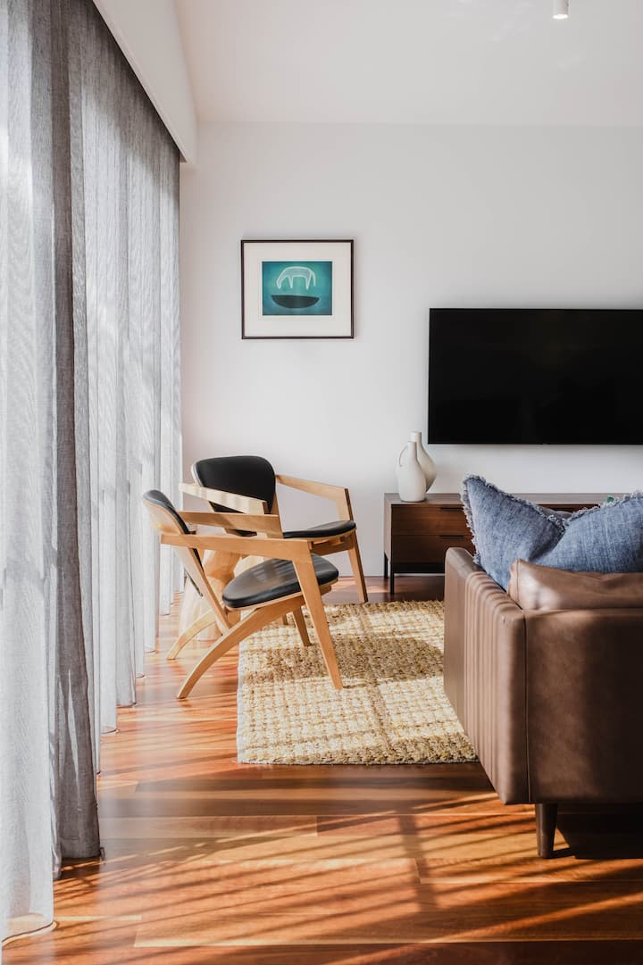 La maison de ville présente des intérieurs d'imprimés d'art en édition limitée, un salon sur deux niveaux, une grande cuisine moderne avec un garde-manger spécialement conçu, des planchers polis, des téléviseurs à écran plat, ainsi qu'un espace de vie généreux habillé du meilleur du mobilier design et des plus beaux meubles d'Europe et d'Australie.