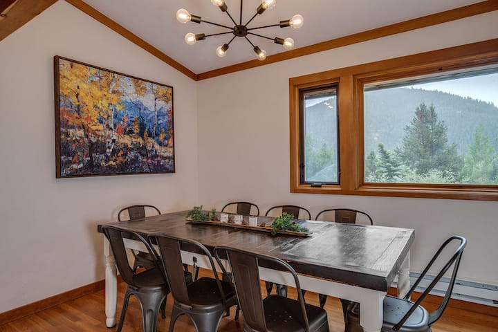 La cuisine gastronomique, avec de nouvelles armoires en cerisier et du granit, est équipée de tout le nécessaire pour cuisiner un repas incroyable. Profitez de la salle à manger ouverte de style ferme tout en admirant la vue sur les montagnes bordées de pins et de trembles. Ou aventurez-vous sur la terrasse spacieuse pour cuisiner sur le gril à gaz ou siroter du vin ou du café (infusé dans le Keurig) pendant les chaudes journées d'été ou les soirées fraîches de la montagne.