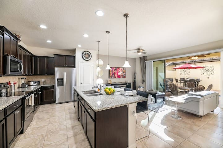 La maison dispose d'un grand salon ouvert, d'une salle à manger et d'une cuisine avec un grand îlot de cuisine et de nombreux espaces de cuisine pour toute la famille. Quatre tabourets de bar à l'îlot de la cuisine font de la cuisine un lieu de rendez-vous préféré pour les familles en visite. Les portes coulissantes s'ouvrent sur votre propre patio et votre piscine avec chaises longues pour profiter de notre beau temps de Floride.
