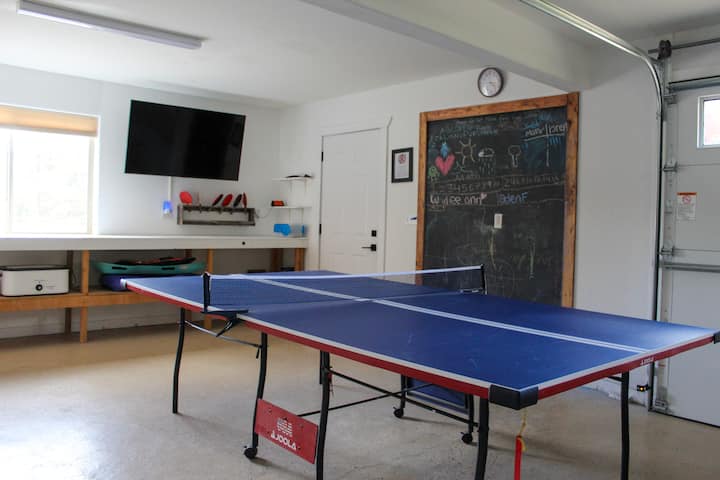 Escapade parfaite pour les familles! Il y a une salle de jeux séparée pour les enfants, une table de ping-pong pour des heures de jeu, un barbecue extérieur Weber, une table à gaz sur la terrasse avant pour profiter d'un moment confortable à l'extérieur, une très grande table de cuisine pour les repas en famille ou les soirées jeux, et la cuisine a tous les appareils disponibles pour un repas gastronomique.