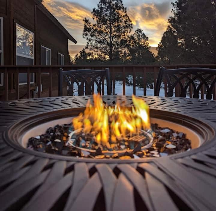 Terrasse : sortez directement sur la grande terrasse où vous pourrez vous détendre et admirer la vue imprenable et les animaux sauvages qui passent souvent. Ou rassemblez-vous autour du foyer extérieur accueillant, idéal pour faire griller des guimauves et vous détendre sous le ciel étoilé.