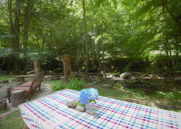 Cabane ensoleillée et confortable au bord d'un ruisseau