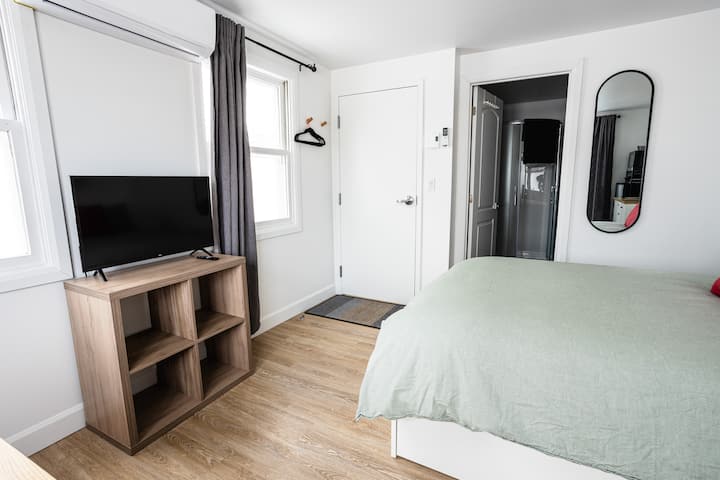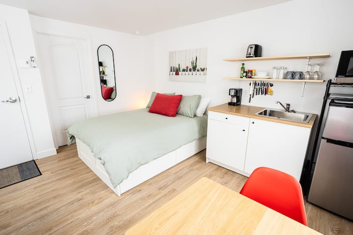 Bonjour, nous sommes une entreprise familiale qui opère des unités Airbnb. Nous sommes aussi propriétaire de l'ancienne église située à côté. On y retrouve, entre autres, Cara BLOC un centre d'escalade intérieur. À même ce centre d'escalade, vous y trouverez un petit bistro qui offre des repas et aussi des consommations alcoolisées et non-alcoolisées.