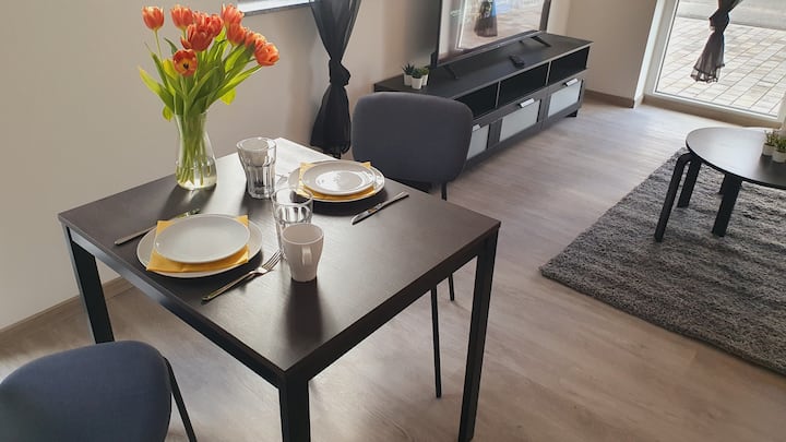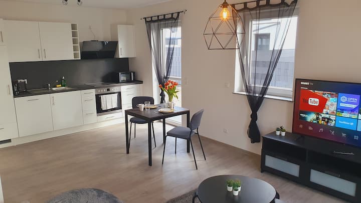 Appartement moderne de 2 pièces, terrasse, cuisine, central