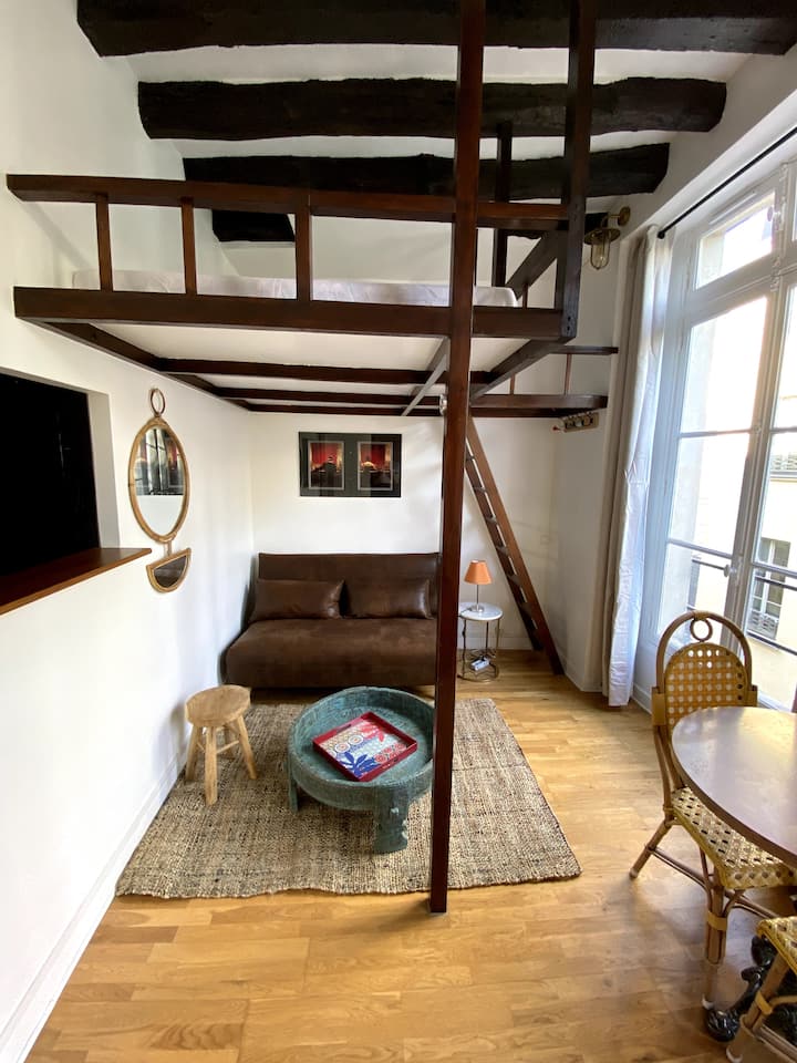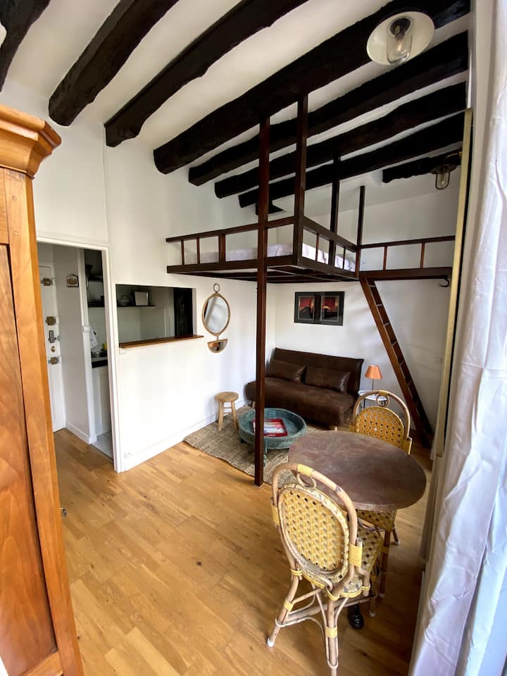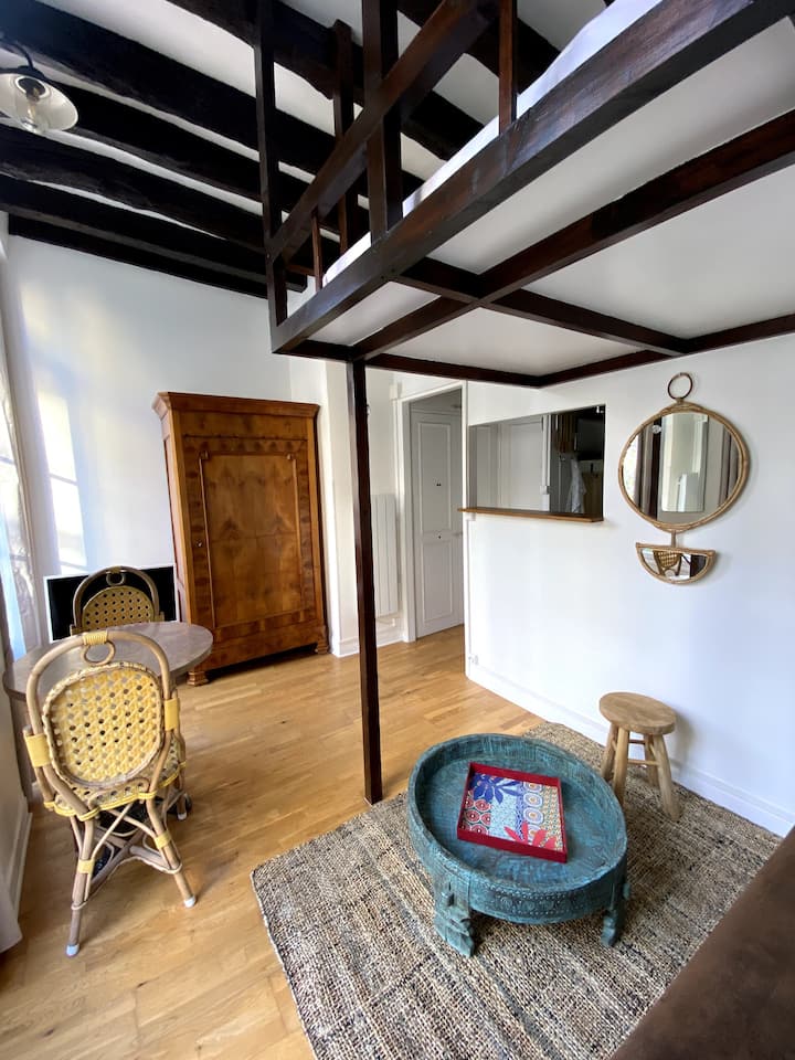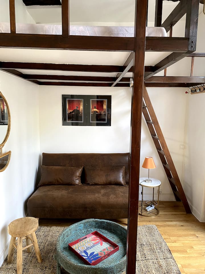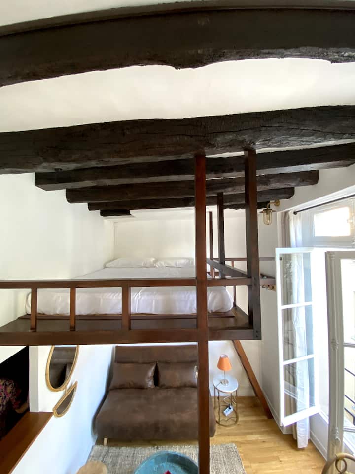 Au 3ème étage sans ascenseur, dans un immeuble aux pierres et poutres apparentes, un studio de 15m2 comprenant une pièce à vivre, partie cuisine et salle de bain séparée. La mezzanine avec une hauteur sous plafond de 1 mètre dispose d’un matelas de 190/140 cm avec alèse, deux oreillers de 60/40 cm avec protège oreiller. Hauteur en dessous de la mezzanine 190cm. Selon la saison une couette tempérée de 200/200 cm ou une couette légère de 240/200 cm, ou un drap plat.