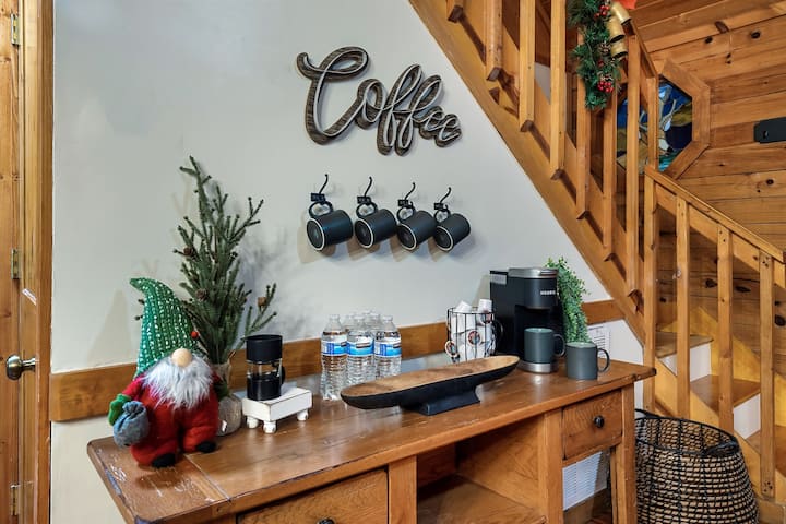 Nous avons également ce qu'il faut pour les amateurs de café. Notre bar à café vous propose une machine Keurig K-mini. Nous vous fournissons même des dosettes K-Cups pratiquement illimitées, afin que vous puissiez profiter d'une tasse de café aromatique dès que vous entrez dans le chalet. Avec un accès facile au porche avant, pourquoi ne pas prendre votre café à l'extérieur pour profiter de la vue magnifique et de l'air frais ?