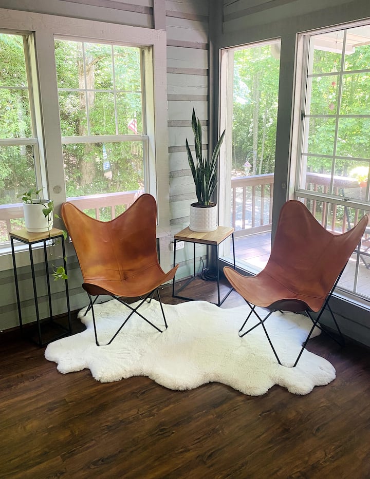 Dans le salon en bas des escaliers, vous trouverez un canapé confortable, un coin salon avec deux chaises en cuir et un beau poêle à bois en pot confortable. Il y a une grande terrasse avant qui a une table patio avec des chaises, une balançoire en bois et deux chaises à bascule. La terrasse surplombe les montagnes Blue Ridge.