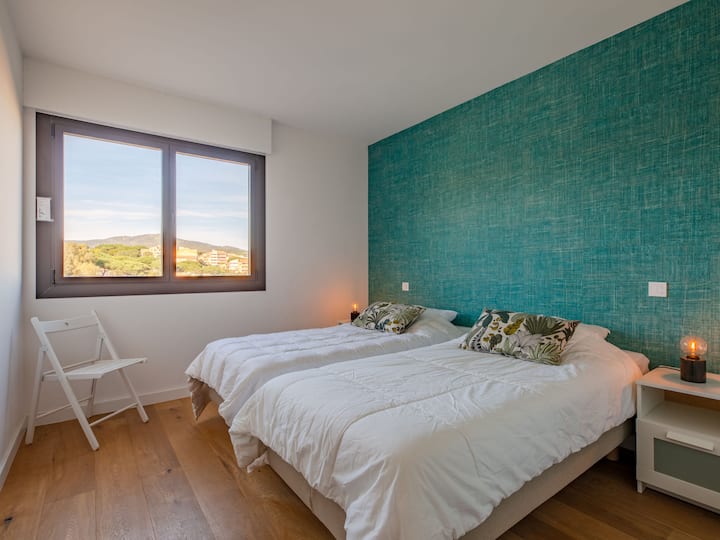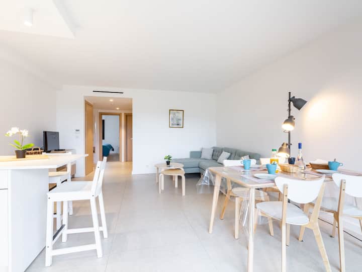Appartement 3 pièces 61 m2 sur 1 étage, position plein sud. Mobilier moderne : salon/salle à manger avec télévision (écran plat). Sortie vers le balcon. 1 chambre avec 1 lit double (2 x 90 cm, longueur 200 cm), climatisation. 1 chambre avec 2 lits (90 cm, longueur 190 cm), climatisation.