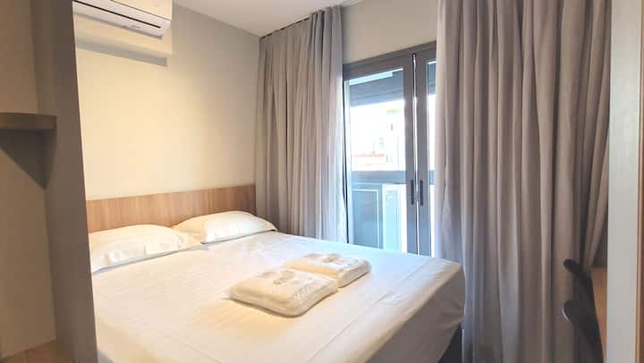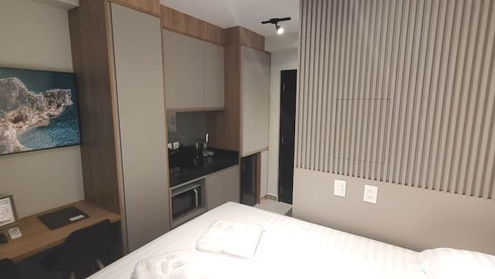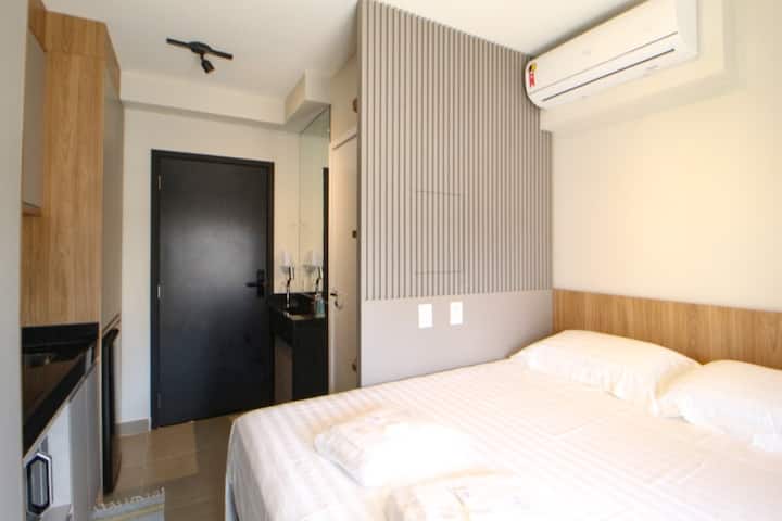 Ici, vous aurez une connexion Internet haut débit Vivo-Fibra (voir le test wi-fi avec l'outil AirBnb dans les équipements), climatisation froide 12000 btus, TV smart 4k 50" super moderne avec antenne numérique (chaînes ouvertes), un espace pour le travail/dîner avec deux chaises, un lit queen avec box et matelas castor, des oreillers incroyables, en plus des stores extérieurs black-out plus les rideaux intérieurs avec black-out et voil, pour un repos bien mérité.