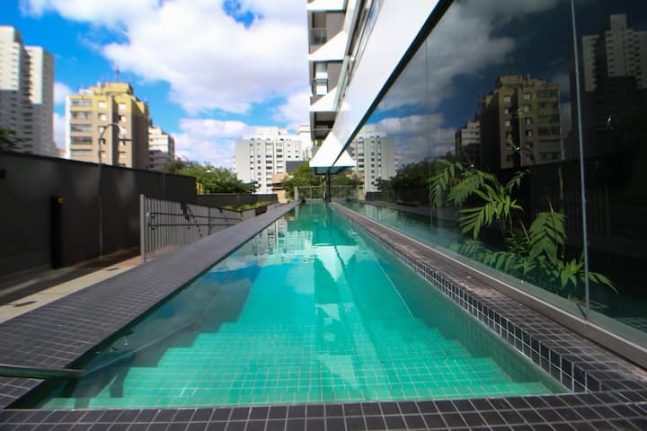 Bel appartement, 1 chambre (suite) 19 m2, 14e étage, à 50 mètres du métro Oscar Freire, nouveau bâtiment (livré en 2021), concierge 24h/24, à côté du métro Oscar Freire, sans parking, piscine, buanderie collective, Lounge bar, cuisine commune de la copropriété qui peut être louée séparément, salle de sport et cowork.