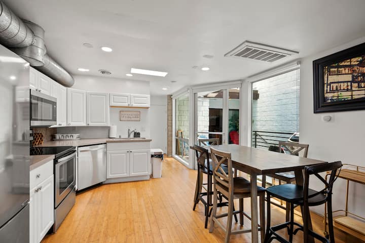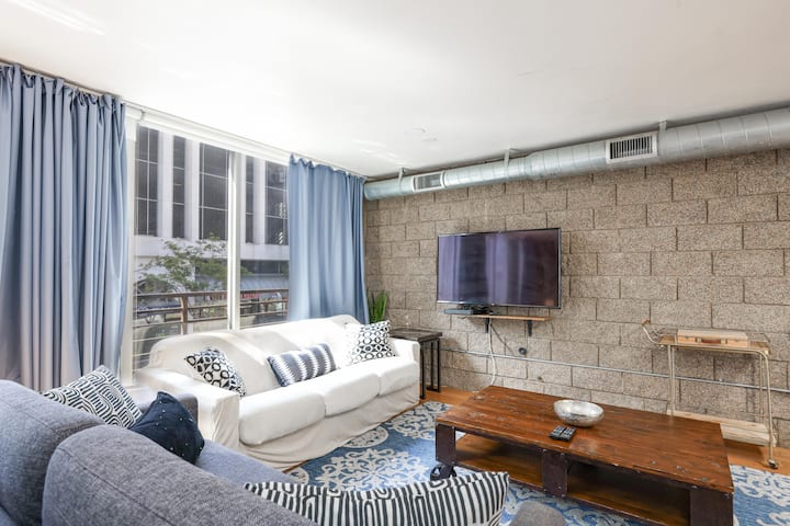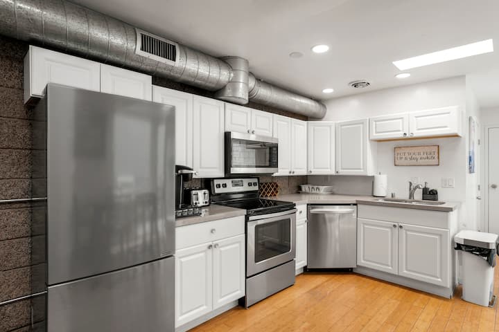 Le studio se trouve dans un bâtiment commercial, qui bloque la plupart des bruits de rue et crée un salon très privé. Avec seulement trois autres appartements dans l'immeuble, cet appartement de deuxième étage est aussi isolé que possible dans cette partie du centre-ville. Un court escalier vous amène dans un studio très spacieux qui peut facilement accueillir 1 lit King, un canapé-lit queen et un matelas gonflable électrique queen size disponible.
