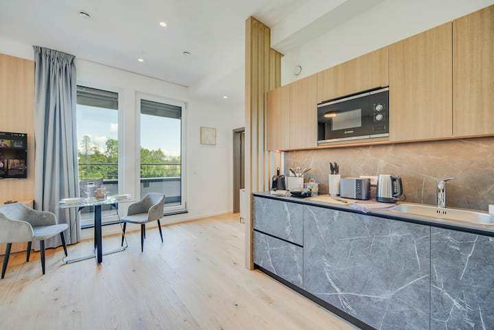 BRiGHT : Studio avec balcon, climatisation, stationnement et cuisine