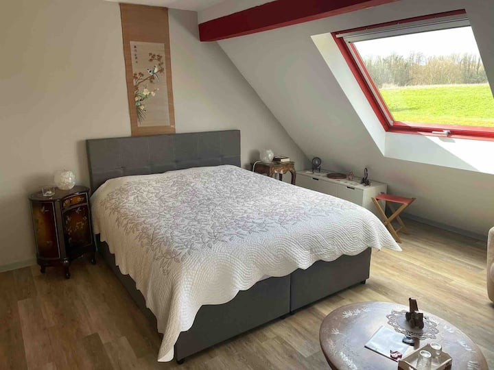 La maison est au milieu des champs, pas de bruit, que les petits oiseaux à votre réveil .