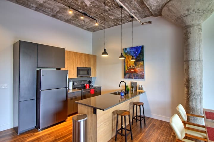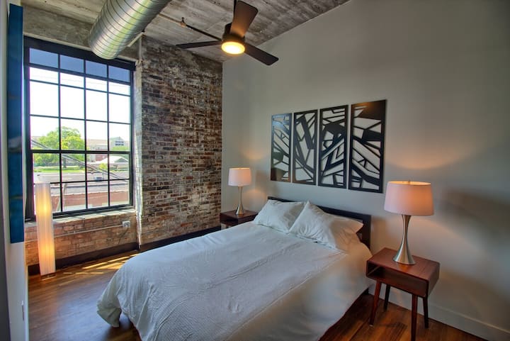 Le Nash Loft est une superbe suite minimaliste d'une chambre avec des plafonds de 12' et des fenêtres industrielles en acier de 7', un espace ouvert spacieux, une laveuse et une sécheuse empilables, une salle de bain design avec des luminaires en acier inoxydable noir et une douche en verre sans cadre, une cour communautaire éclairée par Edison et une cuisine entièrement équipée avec des appareils en acier inoxydable noir et des plans de travail en quartz. Situé le long de la célèbre Locust Street au cœur de Midtown, vous serez à quelques pas de SLU, Wells Fargo, BJC et The Grove.