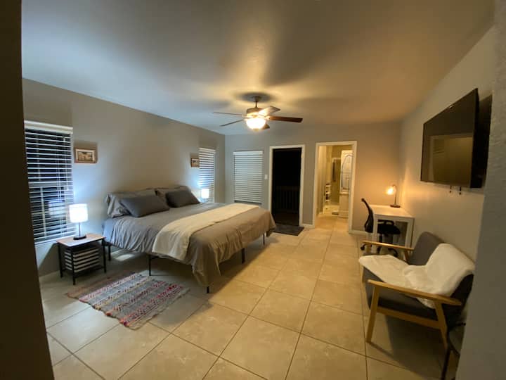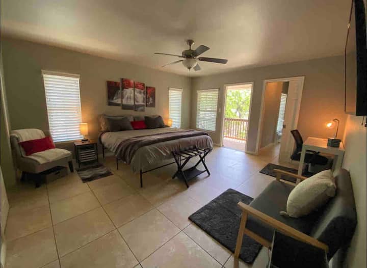 À seulement 4 miles de JBSA Lackland. Cette grande suite entièrement privée avec lit King Size au 2e étage dispose d'un balcon privé, d'une salle de bain attenante complète, d'une salle de bain attenante Keurig, d'un bureau, d'un dressing et d'une télévision connectée 50". Buanderie gratuite ouverte 24h/24 sur place. Vous trouverez une cuisine entièrement équipée pour cuisiner les repas, un salon et une salle à manger complète. Emplacement et hébergement parfaits pour les affaires ou les loisirs. (Renseignez-vous sur les frais de ménage mensuels.)