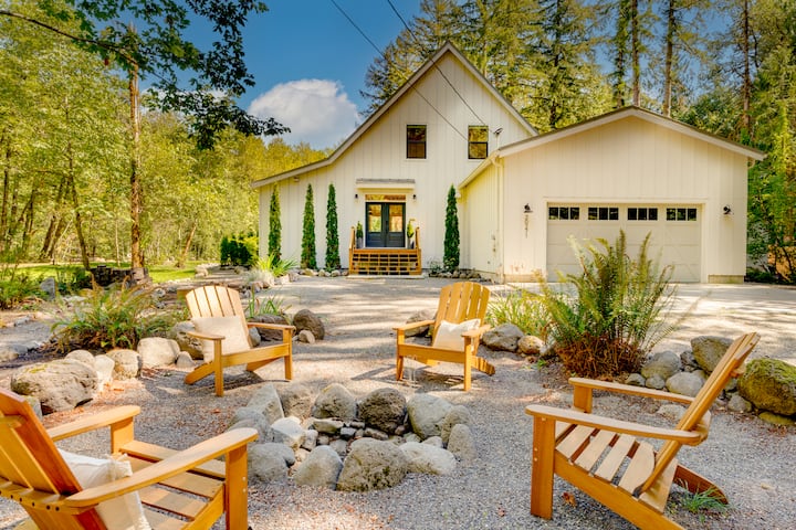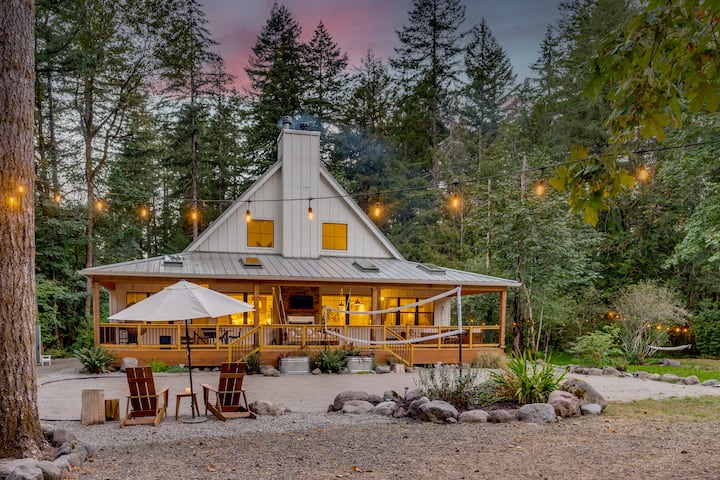 Bienvenue chez Magnolia Pine. Notre ferme moderne sur la rivière est un lieu de vacances de luxe dans le magnifique mont Hood Oregon. Juste quelques instants des pistes, restaurants, randonnées, golf, pêche et tout ce que cette belle région a à offrir. Maison propre, magnifiquement conçue, plus récente avec tous les nouveaux meubles et draps de luxe. L'étage principal dispose d'un design à aire ouverte qui est idéal pour se rassembler, avec des plafonds voûtés, de grandes fenêtres mettant en valeur les beaux arbres, la rivière Sandy, un terrain de volleyball de sable privé et une cour arrière paysagée. Foyer au bois dans l'espace de vie principal avec grande télévision connectée à écran plat et Wi-Fi haut débit.