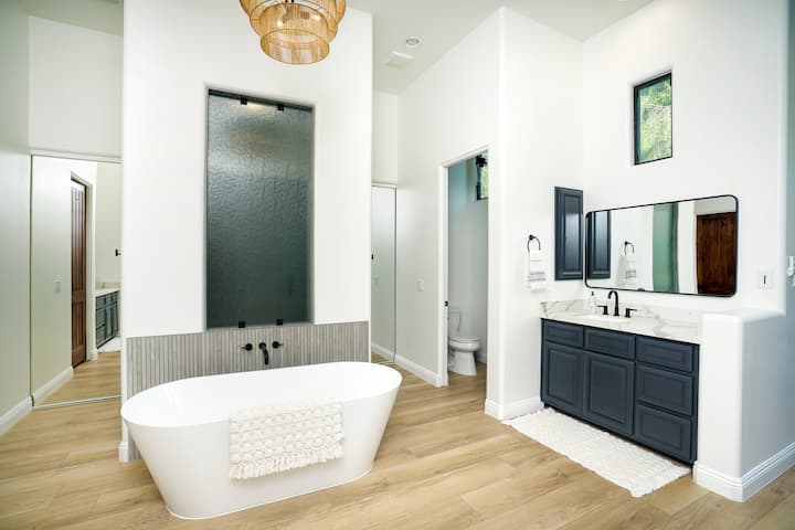 Les salles de bains élégantes sont équipées de matériel noir de jais et d'armoires bleu marine ou grises, s'inscrivant dans le thème moderne de la maison. La première salle de bain est attenante à la chambre principale et dispose d'une douche à l'italienne pour deux personnes avec pommeaux de douche opposés. Prenez un bain à remous dans la grande baignoire centrée entre les deux lavabos opposés et deux toilettes privées.